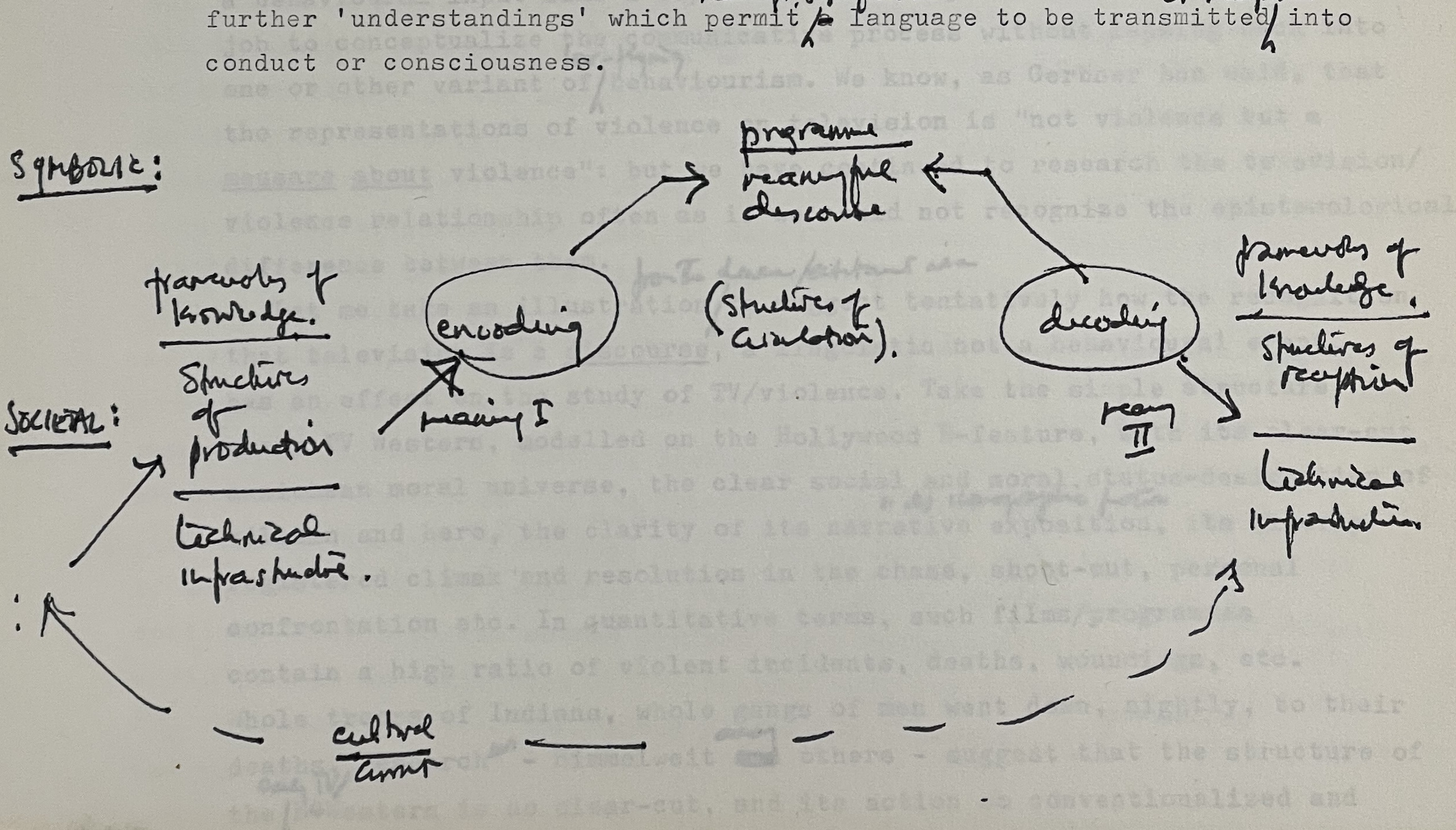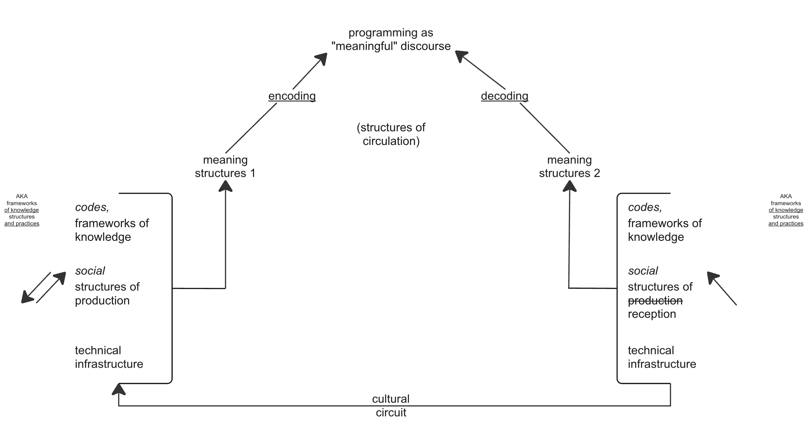 Cultural studies theorist Stuart Hall, “Encoding/Decoding,” combined versions from archive drafts and published editions of 1973, 1980. Illustration by Ciston.